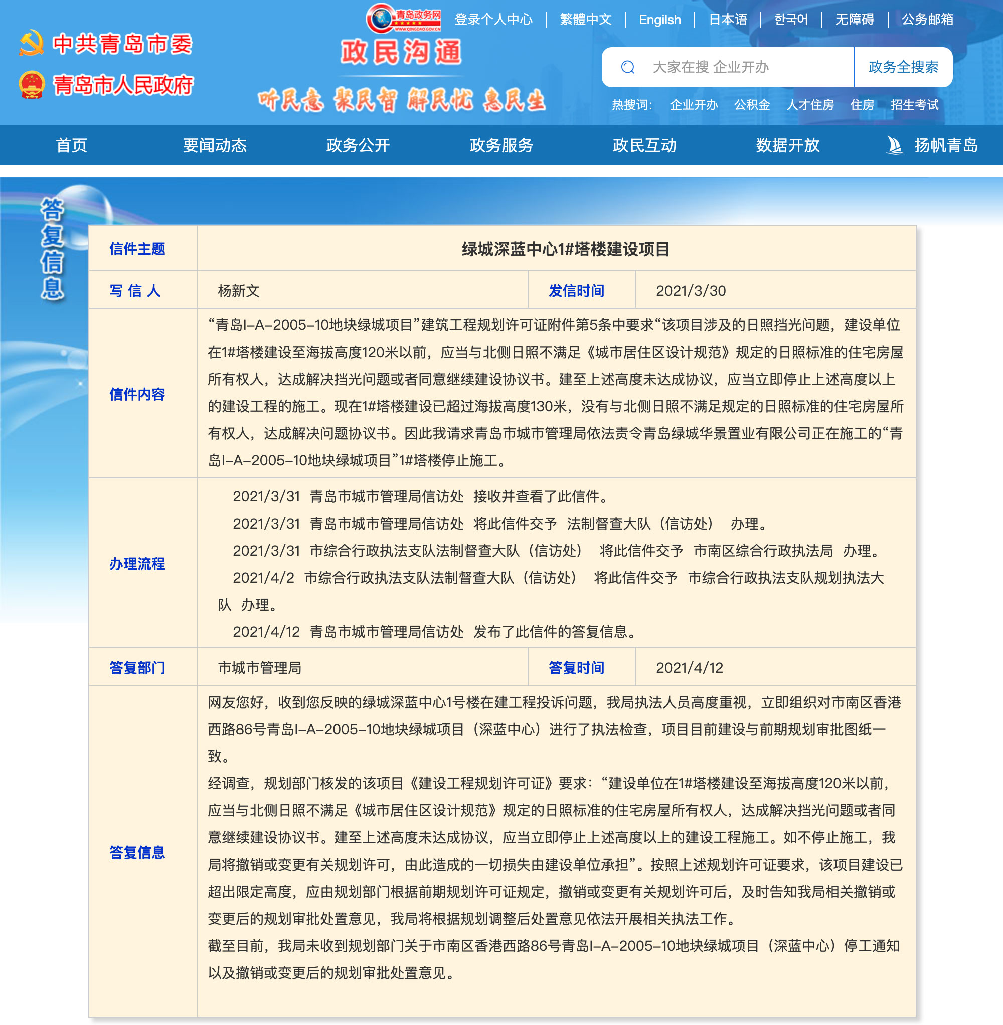 针对该市民提出的问题,青岛市城市管理局4月12日作出以下答复:网友您好,收到您反映的绿城深蓝中心1号楼在建工程投诉问题,我局执法人员高度重视,立即组织对市南区香港西路86号青岛I-A-2005-10地块绿城项目(深蓝中心)进行了执法检查,项目目前建设与前期规划审批图纸一致。经调查,规划部门核发的该项目《建设工程规划许可证》要求:“建设单位在1#塔楼建设至海拔高度120米以前,应当与北侧日照不满足《城市居住区设计规范》规定的日照标准的住宅房屋所有权人,达成解决挡光问题或者同意继续建设协议书。建至上述高度未达成协议,应当立即停止上述高度以上的建设工程施工。如不停止施工,我局将撤销或变更有关规划许可,由此造成的一切损失由建设单位承担”。按照上述规划许可证要求,该项目建设已超出限定高度,应由规划部门根据前期规划许可证规定,撤销或变更有关规划许可后,及时告知我局相关撤销或变更后的规划审批处置意见,我局将根据规划调整后处置意见依法开展相关执法工作。截至目前,管理局未收到规划部门关于市南区香港西路86号青岛I-A-2005-10地块绿城项目(深蓝中心)停工通知以及撤销或变更后的规划审批处置意见。