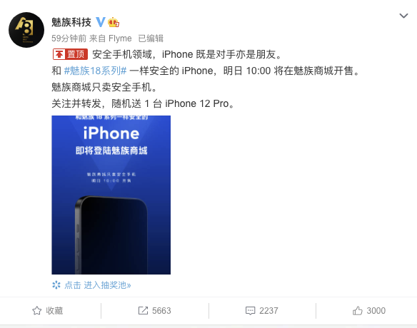 4月15日上午,魅族科技通过官方微博发文表示,安全手机领域中,iPhone既是对手亦是朋友,并宣布“和魅族18系列一样安全的iPhone”明日10:00将在魅族商城开售。