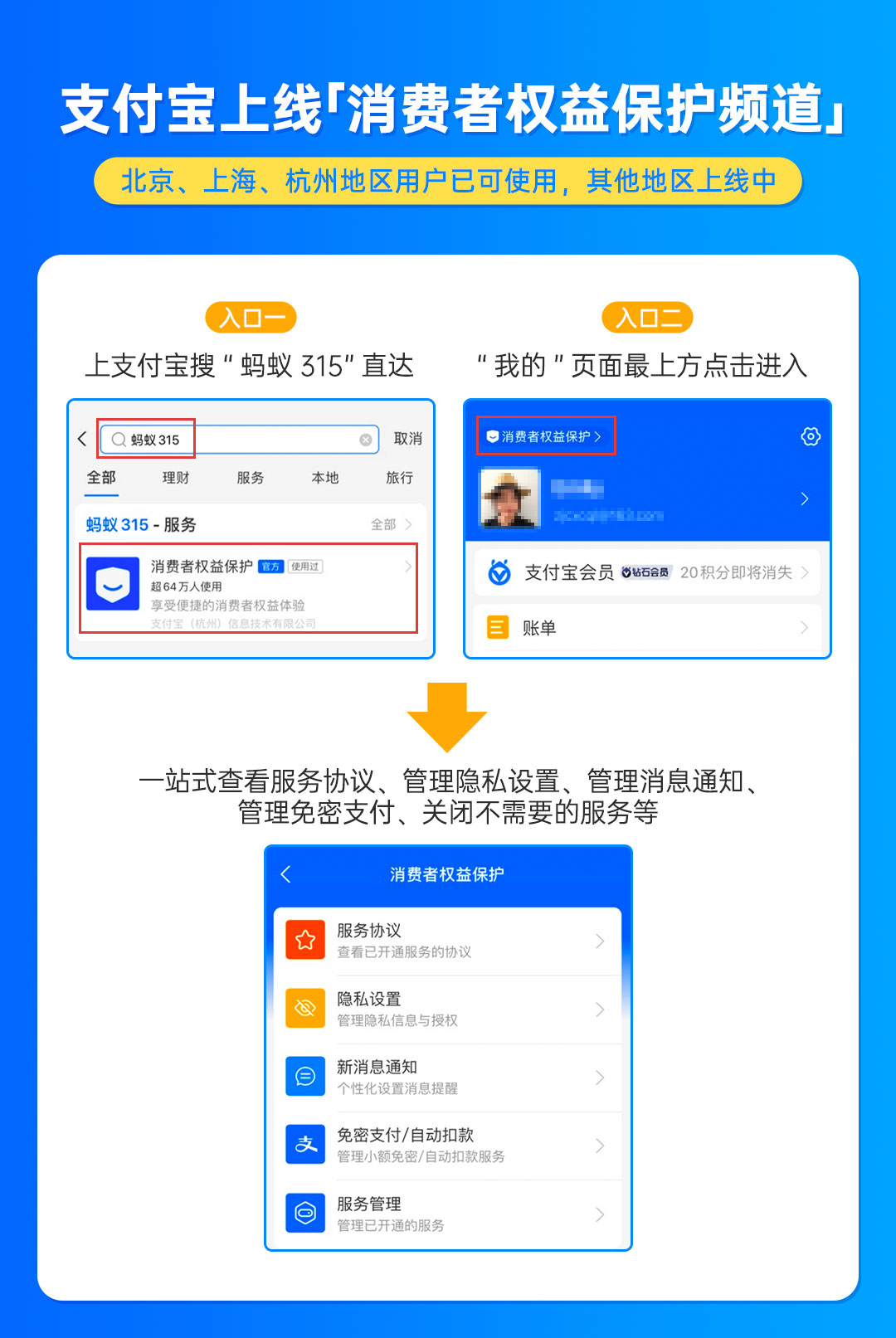 “蚂蚁315”专项小组负责人丁翌表示,持续升级消费者权益保护是蚂蚁集团今年最重要的事情之一,希望一站式的消保频道能让消费者更好地行使对产品使用的自主权,自主选择和管理服务,并且对相关服务内容充分知情、一目了然。频道正在试点期间,下一步将继续针对隐私保护、第三方免密扣款管理等进一步迭代。目前,消费者上支付宝搜“蚂蚁315”、“315”、“消费者权益保护”等都可进入消保频道,进行相应设置。