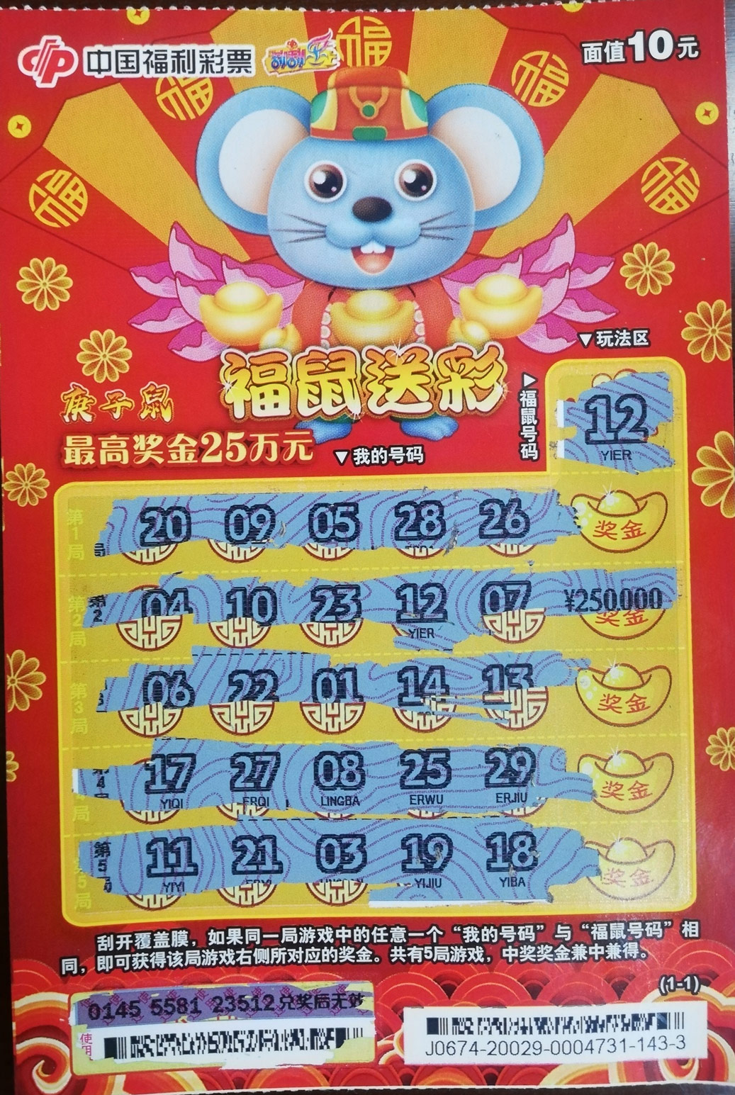 4月8日晚,马先生和朋友聚餐时喝了一点小酒,在散步回家的路上经过了一家福彩代销点,想到自己这些天都没有买过刮刮乐,便入内买了十张“庚子鼠-福鼠送彩”。“这十张刮刮乐只刮出了几个小奖,然后我便用中奖票又换了两张‘庚子鼠-福鼠送彩’。”马先生表示,想不到大奖就隐藏在其中一张“庚子鼠-福鼠送彩”之中,当他刮开票面上的薄膜后,只见刮开区中“我的号码”一栏第二行里的数字“12”与福鼠号码完全一致!而后边奖金区则出现了25万元字样的奖金图符。“我还以为自己喝了酒眼花,数了好几遍才敢确定是中了25万元。”谈及中奖时的情形,马先生如是说道。