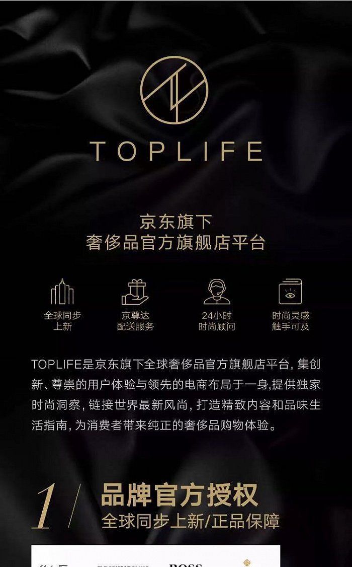 2017年10月,京东全资开发的奢侈品服务平台Toplife正式上线,以品牌官方旗舰店的模式链接各大国际国内奢侈品牌。该平台独立于京东主站而运营。而就在同一年6月,京东以3.97亿美元的投资成为奢侈品电商发发奇Farfetch的最大股东。