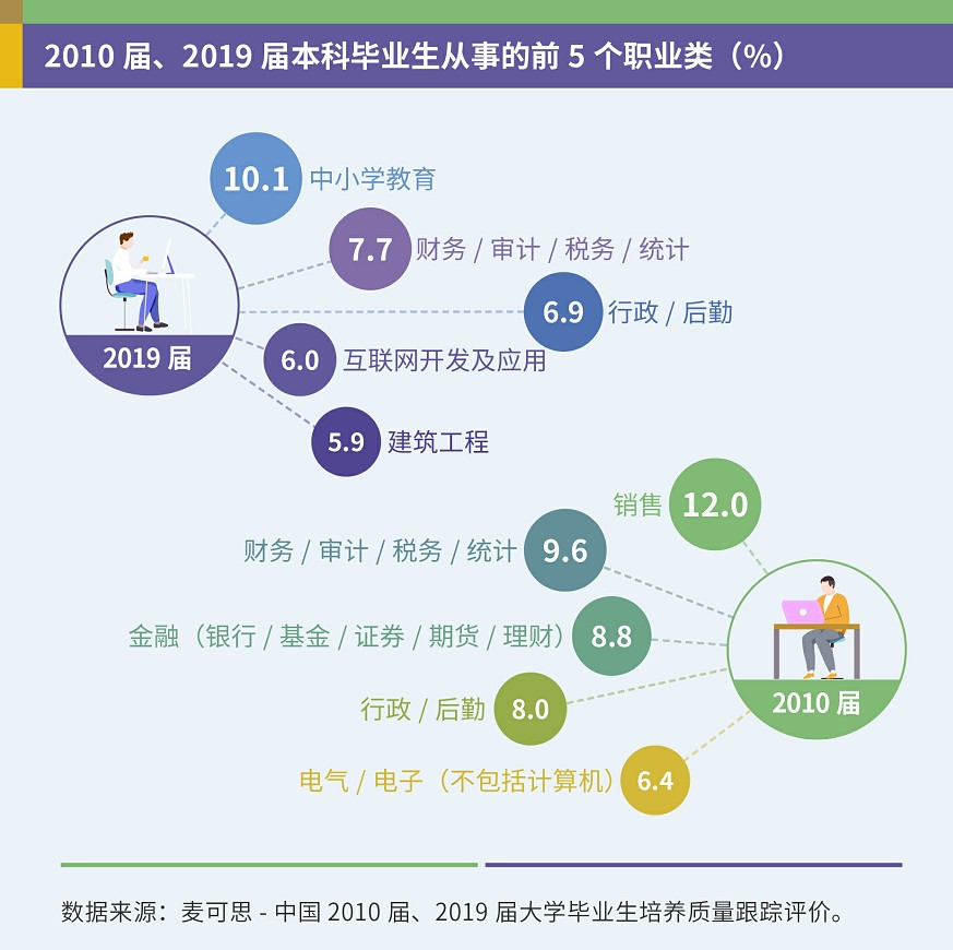 从本科生就业岗位的占比来看,十年前,2010届本科生毕业半年后就业最多的职业类是“销售”(12.0%);十年后,“中小学教育”成为2019届就业的热门职业类,就业比例为10.1%,比2010届上升了7.5%。