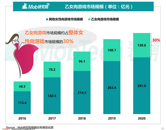 用数据说明或许更为直观。根据mob研究院自有模型估算,中国女性向恋爱游戏的市场规模从2016年的48.5亿元到2017年的78.2亿元,环比增速高达61.2%。