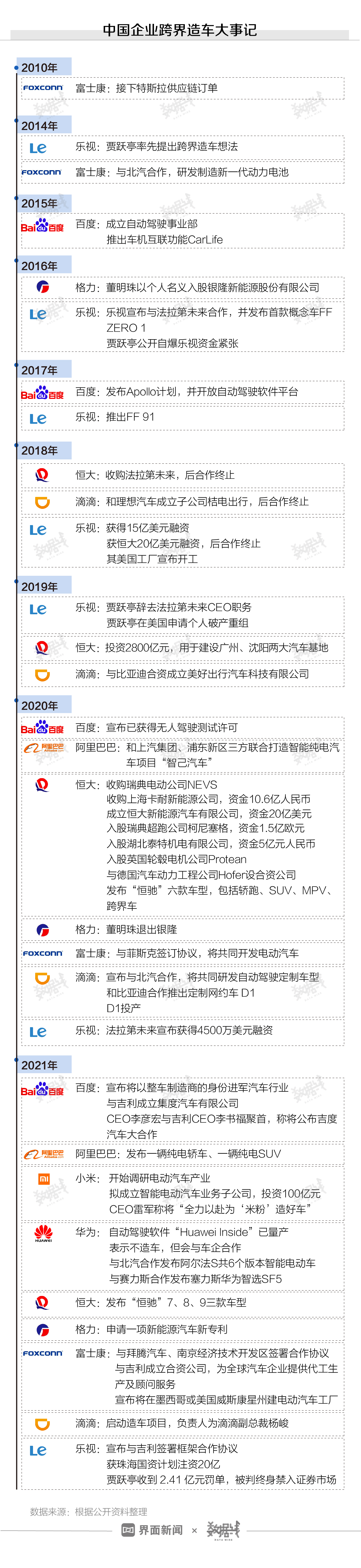 据界面数据不完全统计,自2014年至今,中国共有9家企业宣布跨界造车。