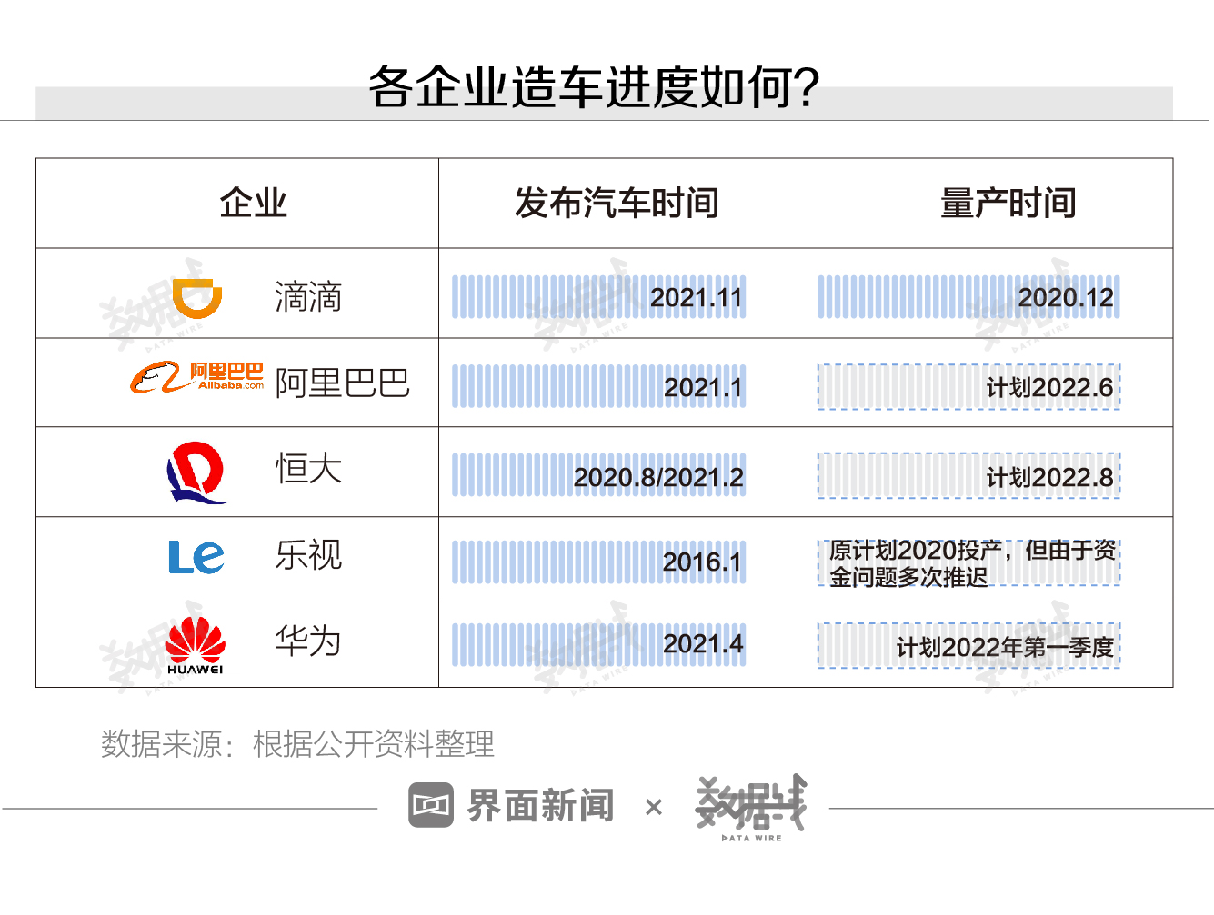 跨界造车企业们的造车进度如何?乐视早在2014年便提出跨界造车设想,2016年推出首款车型FF ZERO 1,但由于资金不足、法律纠纷不断,至今未能投产。2020年下半年,恒大、滴滴先后发布汽车。今年年初,阿里也亮相旗下首款汽车。华为于4月发布与北汽合作的阿尔法S,与塞力斯合作的智选SF5。目前,仅有滴滴一家实现量产,华为、阿里和恒大宣布2022年投产。