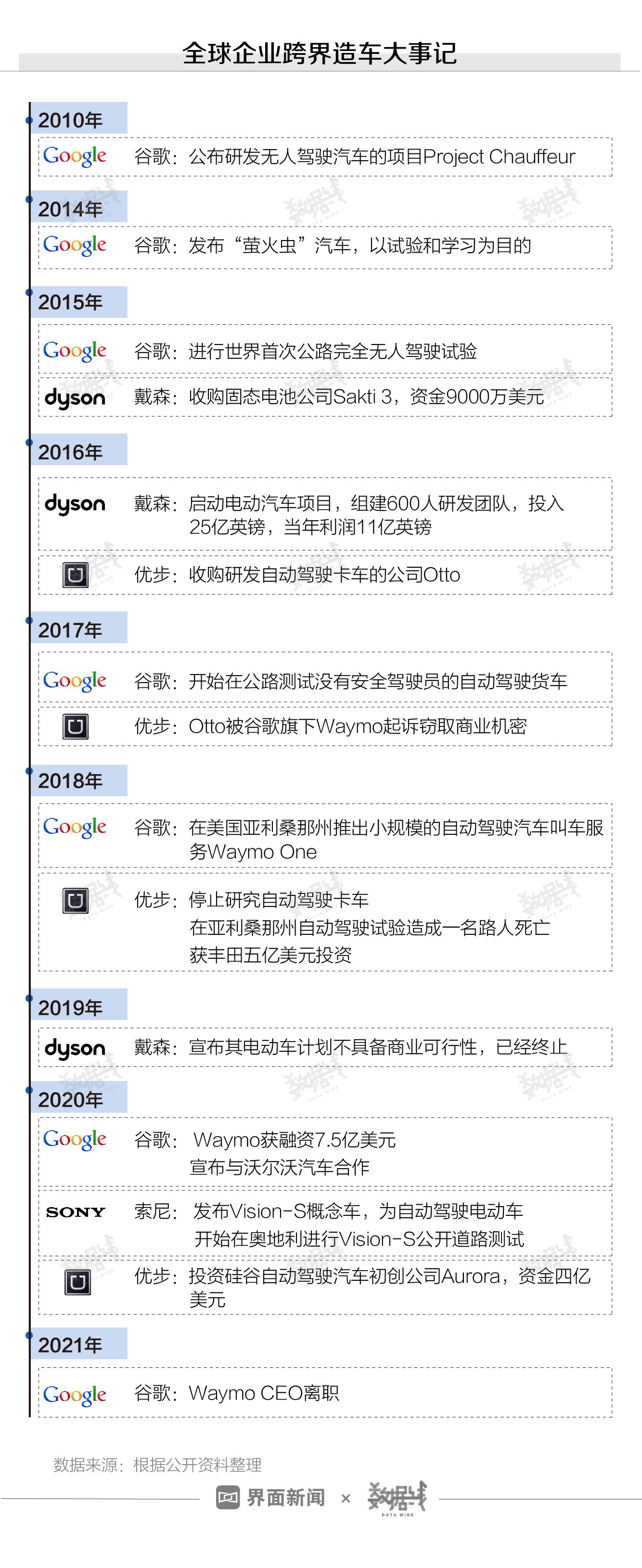 不止中国企业想跨界造车,放眼全球,跨界造车已经不是什么新鲜事。早在2010年,谷歌就率先研发自动驾驶汽车,但人事更动不断,至今未能商业化。据界面数据不完全统计,迄今为止,5家跨界造车的国外企业都没成功投产。