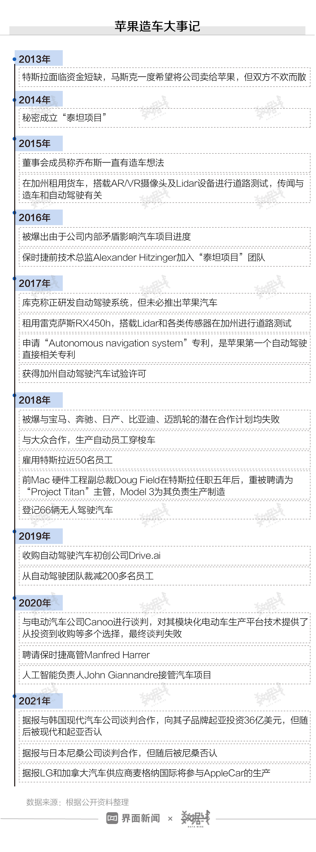 自2015年起,苹果造车的消息便传闻不断,但与多家汽车企业的谈判合作均失败。