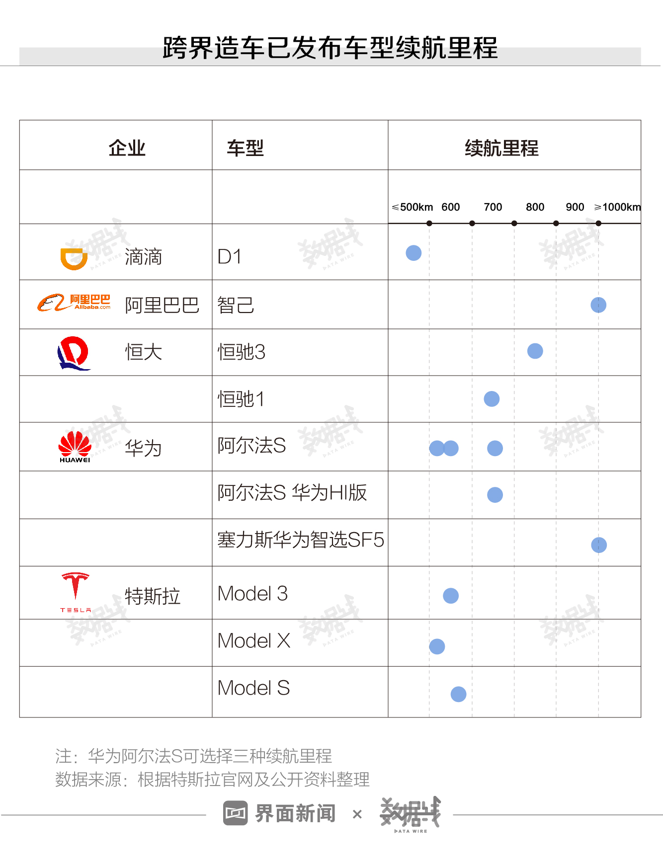 跨界造车企业们造的新能源汽车,续航里程怎么样?对比特斯拉三款电动车,滴滴生产的D1续航里程418km,明显偏低。阿尔法S则有三种续航里程可选,与特斯拉三款汽车续航能力差不多。两款中、高端价位恒驰汽车的续航能力预计比特斯拉略胜一筹。华为即将发布的智选SF5与阿里推出的智己汽车续航能力最强,预计可达1000km以上。
