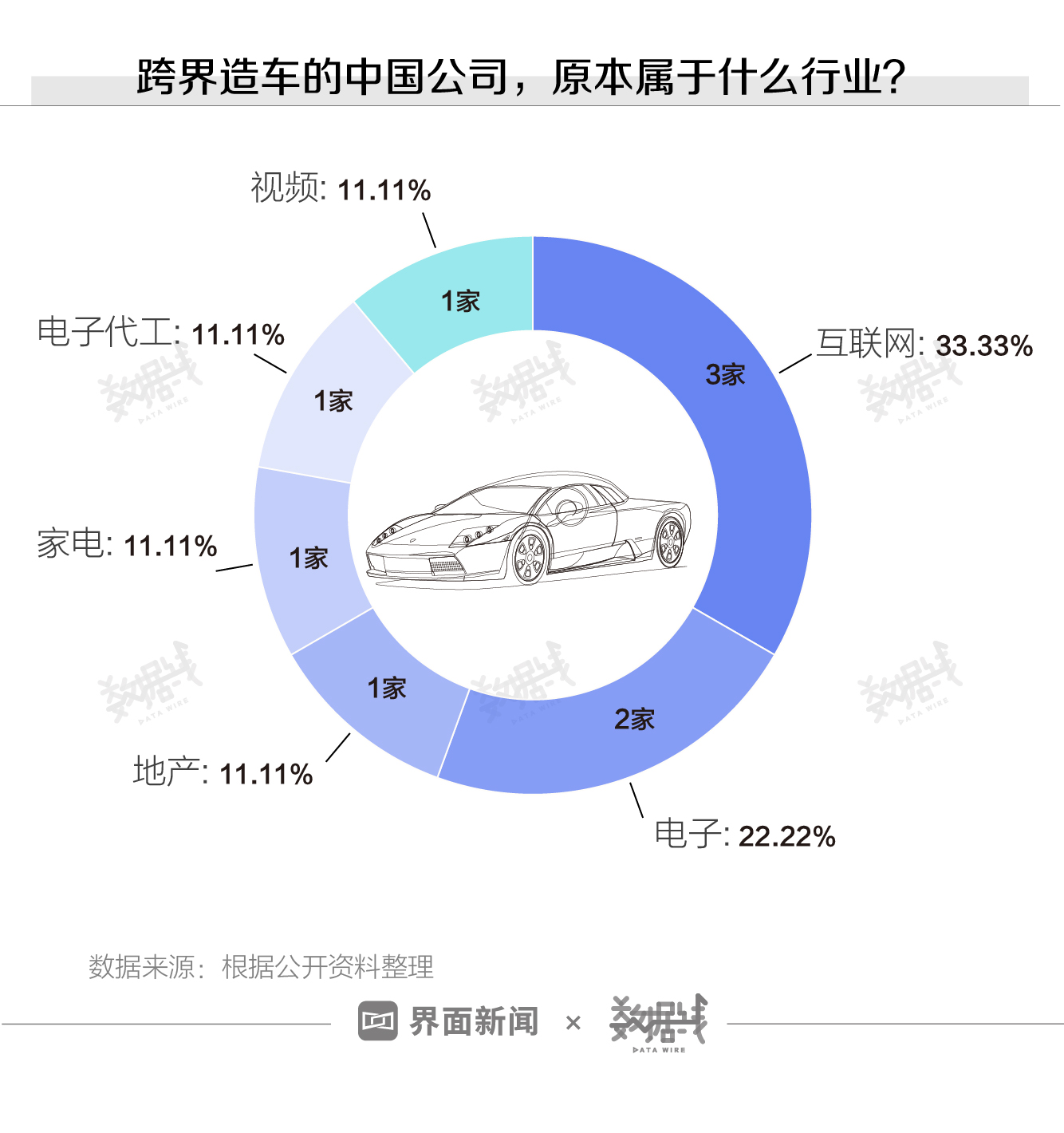 跨界造车企业们原本属于哪些行业?互联网领域有3家,电子领域有2家,其余4家分别来自地产、视频、家电和电子代工行业。