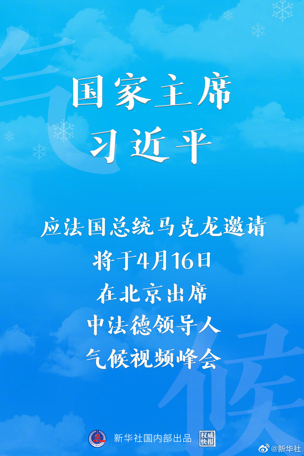 应法国总统马克龙邀请,国家主席习近平将于4月16日在北京出席中法德领导人气候视频峰会。