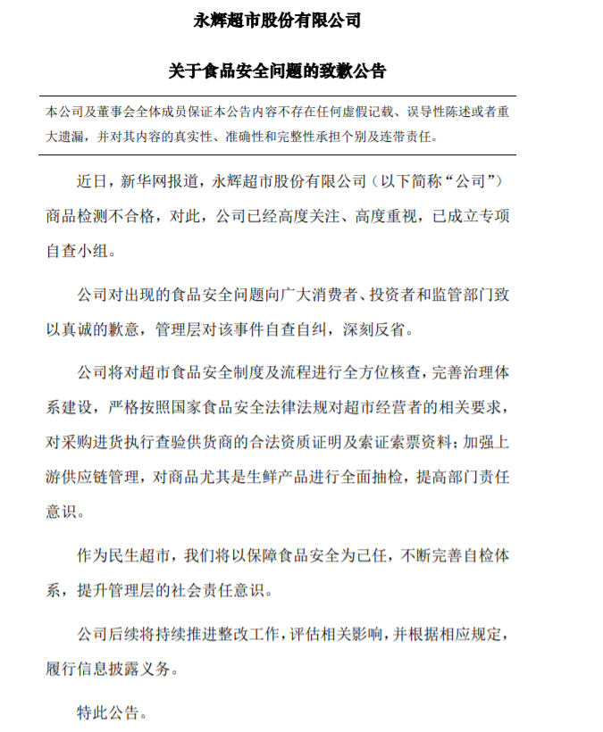 4月15日,永辉超市发布致歉公告称,近日,新华网报道,公司商品检测不合格,对此,公司已经高度关注、高度重视,已成立专项自查小组。公司对出现的食品安全问题向广大消费者、投资者和监管部门致以真诚的歉意,管理层对该事件自查自纠,深刻反省;将对超市食品安全制度及流程进行全方位核查,对商品尤其是生鲜产品进行全面抽检,提高部门责任意识。