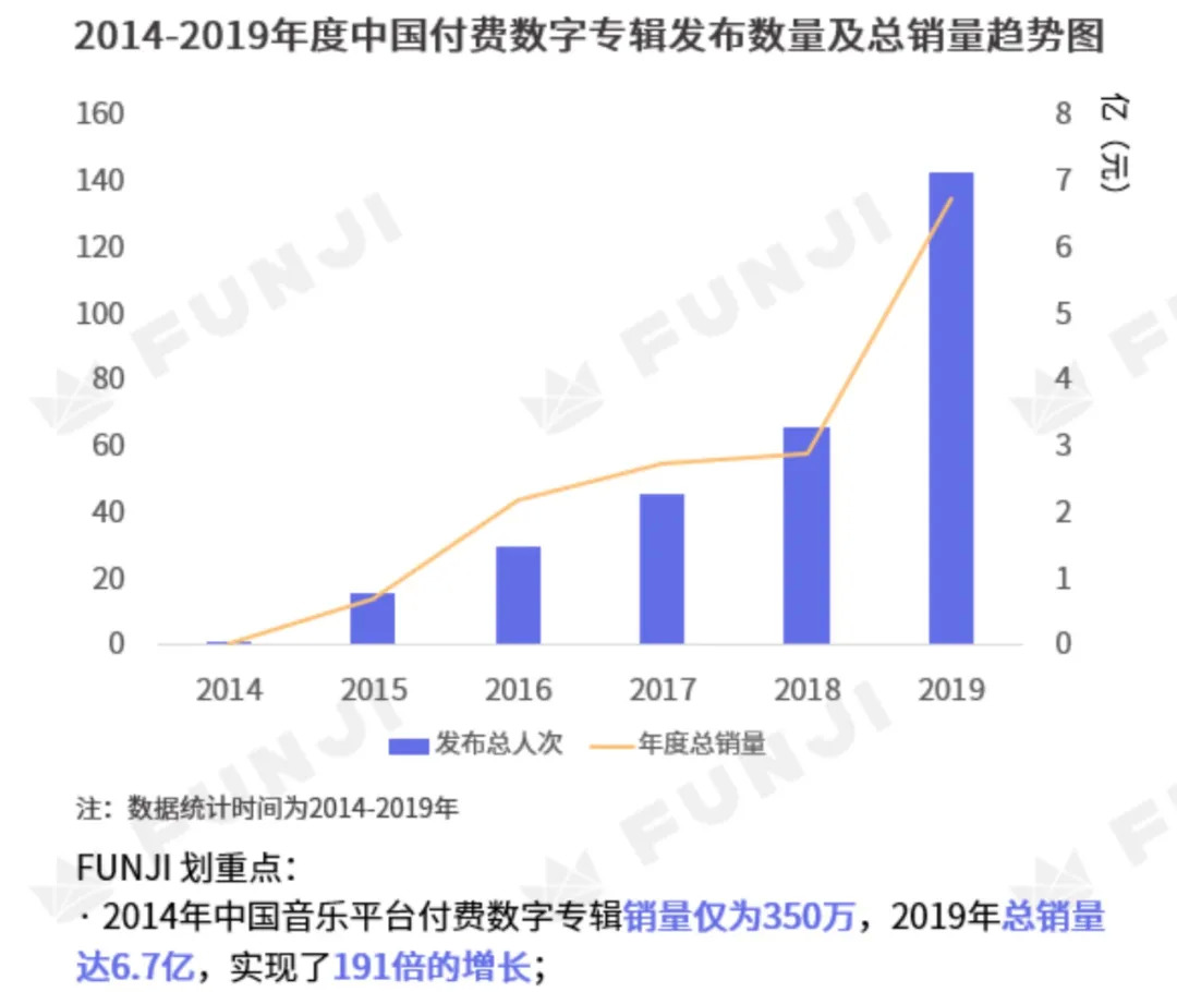 据FUNJI数据的报告显示,从2014年周杰伦在QQ音乐上发表《哎哟,不错哦》开数字专辑售卖先河,到19年的五年间,国内付费数字专辑共产生了15.3亿的销售额。而去年仅上半年,数字专辑总销售额就突破3亿元大关,比19年同期又增长了78.78%。
