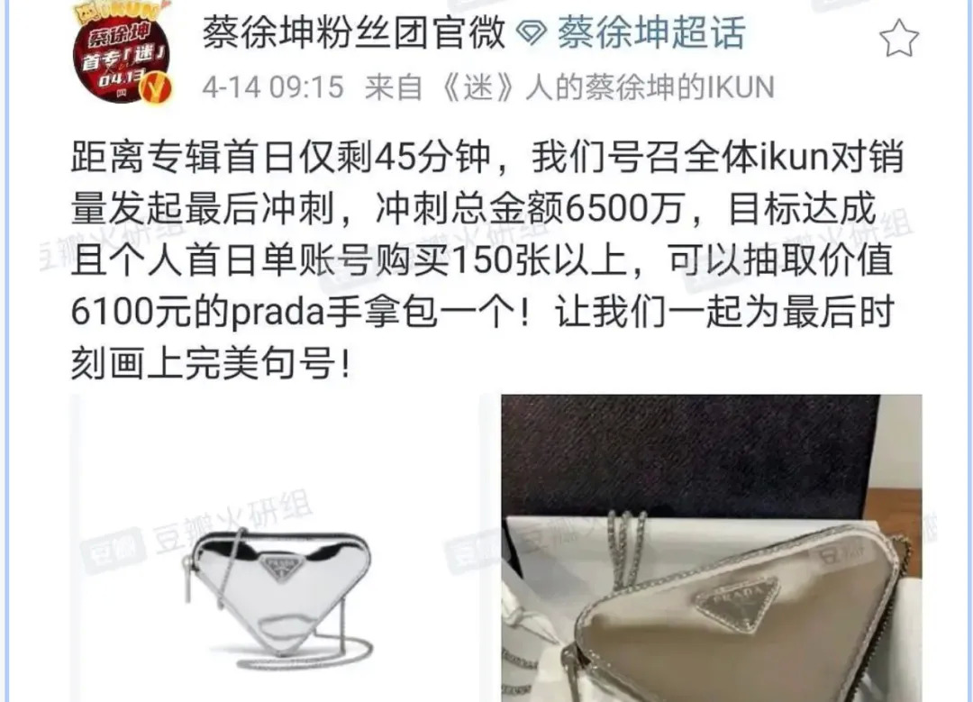 到了14日,蔡徐坤粉丝团官博更是下血本,为冲刺新专总销售额6500万,策划了“个人单账号购买150张以上,有机会抽取价值6100元prada手拿包一个”的活动,随后,被激发斗志的粉丝们开始了又一波花式筹钱。