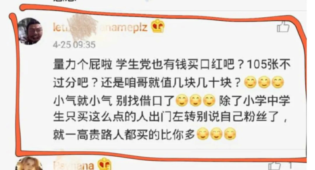 而诸如“你不多买一点你就是不爱他!”、“你买的没有路人多你算什么粉丝!”等饱含着情感绑架的话语,更是带动了一大批学生党粉丝透支自己的零花钱。