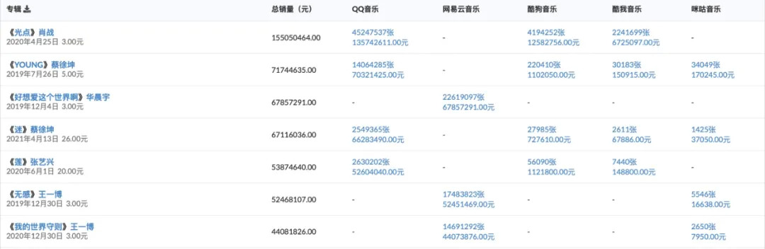 翻开数字专辑销量网的数据,截至发稿,各平台数字专辑销量排行的前7名作品分别是《光点》肖战、《YOUNG》蔡徐坤、《好想爱这个世界啊》华晨宇、《迷》蔡徐坤、《莲》张艺兴、《无感》王一博、《我的世界守则》王一博。
