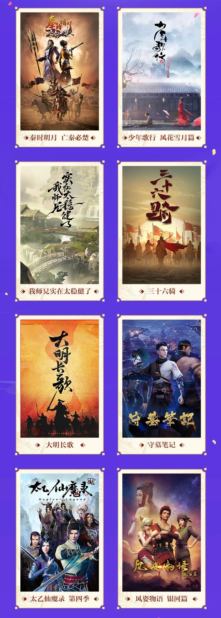 优酷在持续推出《秦时明月》《少年歌行》《太乙仙魔录》《刺客伍六七》等大IP系列、续集作品,以及吸入唐家三少作品《冰火魔厨》、言归正传作品《我师兄实在太稳健了》等热门网文改编动画的基础上,结合优酷动漫的用户心智和“国潮”文化趋势将“新国风”设为发力主赛道,公布了由《少年歌行·风花雪月篇》《秦时明月7》《三十六骑》等8部作品组成的国风内容矩阵。