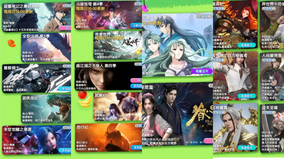 类别上,腾讯视频春季动画仍偏重以战斗、玄幻为主的大男主向动画,且“头部化”、“垂直化”的策略较为清晰,包含了《斗破苍穹 第4季》《画江湖之不良人 第4季》《盗墓笔记之秦岭神树》等市面上最为头部的IP,也在垂类上继续深挖女性用户和粉丝经济。除了持续推出《狐妖小红娘 第十季》《全职法师 第五季》,还公布了原创古风浪漫3D动画作品《眷思量》。
