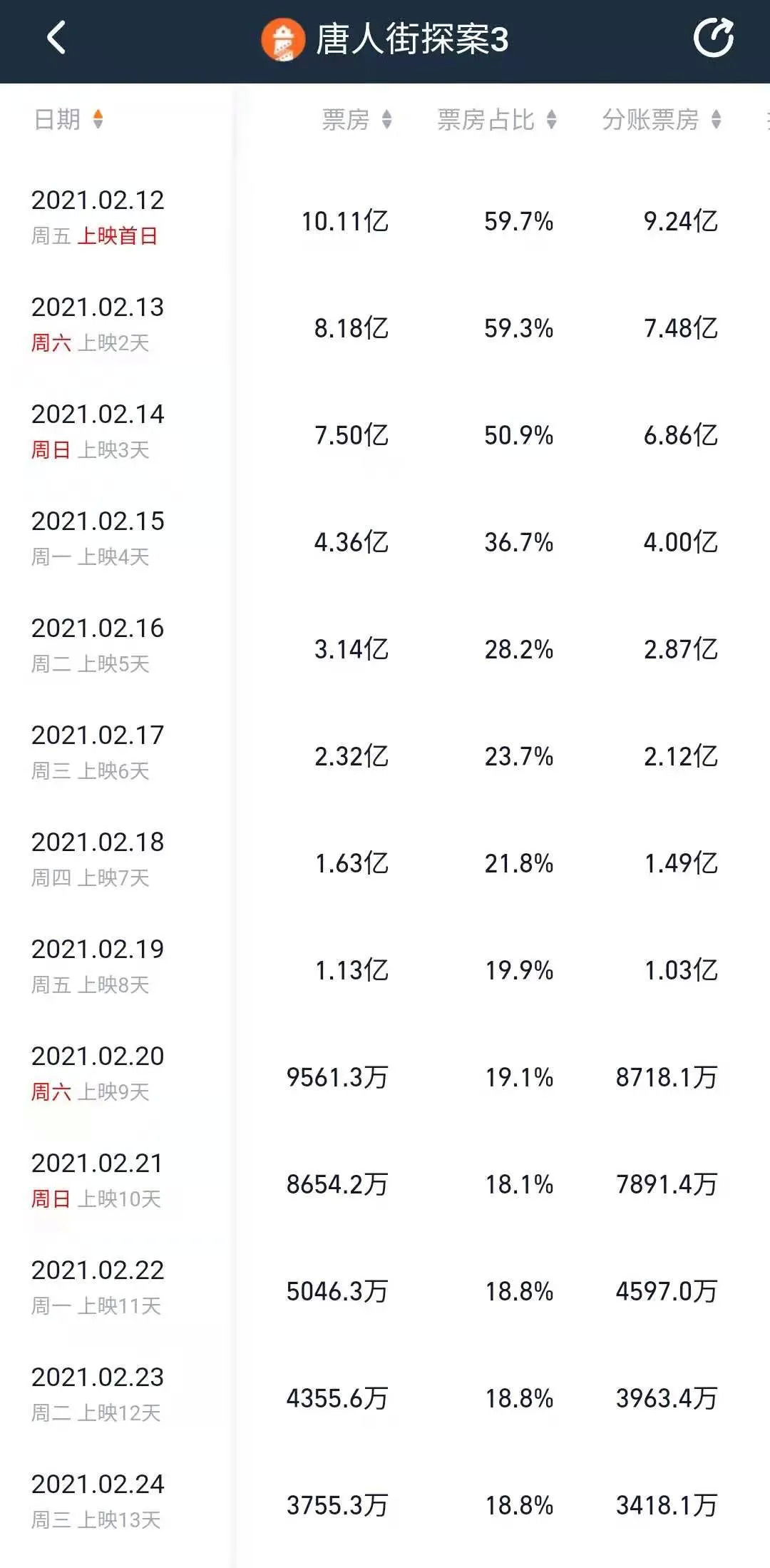 唐人街探案3逐渐走低的票房和排片。数据来源:灯塔专业版