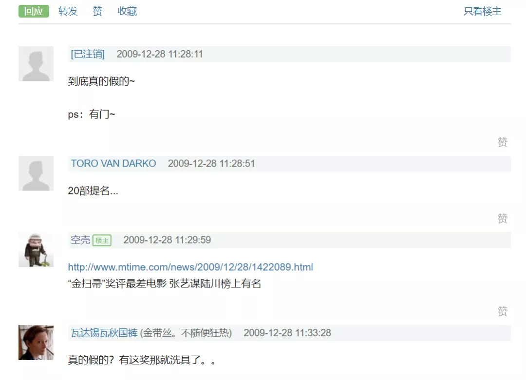 第一届金扫帚奖提名出炉时,一个豆瓣小组的远古帖子在质疑其真实性