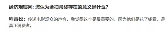 在金扫帚奖创始人程青松的眼中,金扫帚奖存在的最大意义是“传递电影观众的声音”,而与观众的口碑高度重合,又没能有自己独特态度表达的金扫帚,除了“传递声音”这样已经被取代的作用,还能有更大的价值吗?