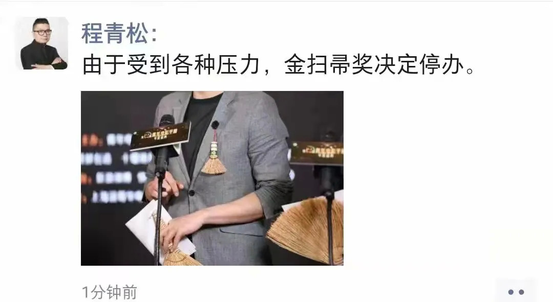 4月1日的晚上,程青松发了一条朋友圈,“因遭受各方压力,金扫帚奖即日停办”。经毒眸(ID:DomoreDumou)求证后,相关人员称“当然是玩笑,不过明年起也将有大变动”。看来,在金扫帚的主办方眼里,和当下的电影市场不相匹配的金扫帚,如今也不得不变了。