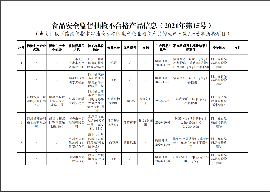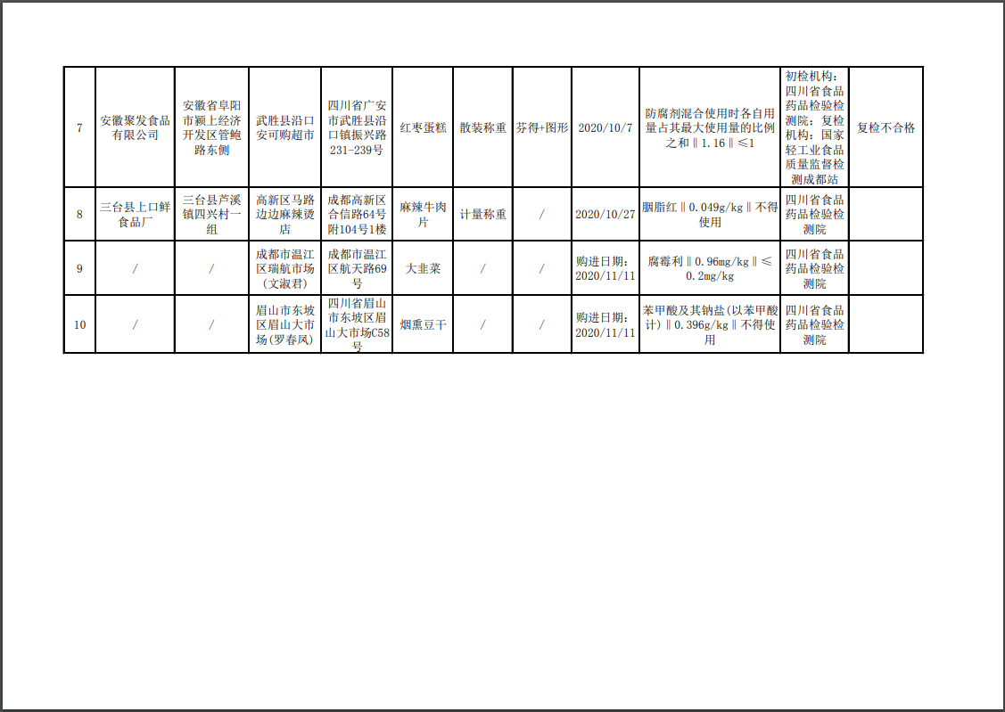 对抽检中发现的不合格食品,省市场监督管理局已责成成都市、绵阳市、广元市、南充市、广安市、巴中市、眉山市、甘孜州市场监督管理局立即组织开展核查处置,督促食品生产企业查清产品流向,采取下架召回不合格产品等措施控制风险;对违法违规行为,依法从严处理;及时将企业采取的风险防控措施和核查处置情况向社会公开。