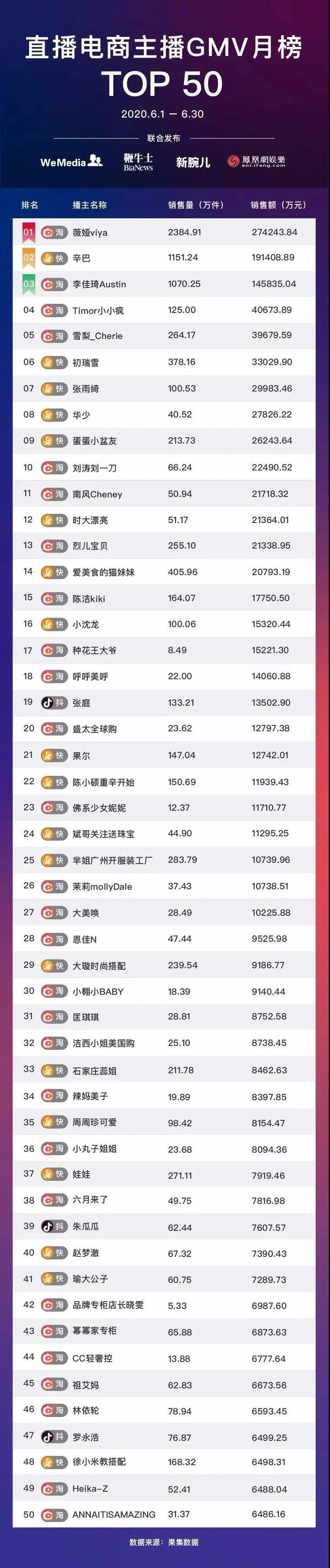 不仅如此,由于明星与带货主播之间存在着天然的壁垒,明星直播带货量往往很难达到品牌方的预期。WeMedia等机构联合发布的2020年6月《直播电商主播GMV月榜》显示,Top50入围主播的累积带货超过126.1亿元,但明星带货GMV的贡献仅为5.6%。
