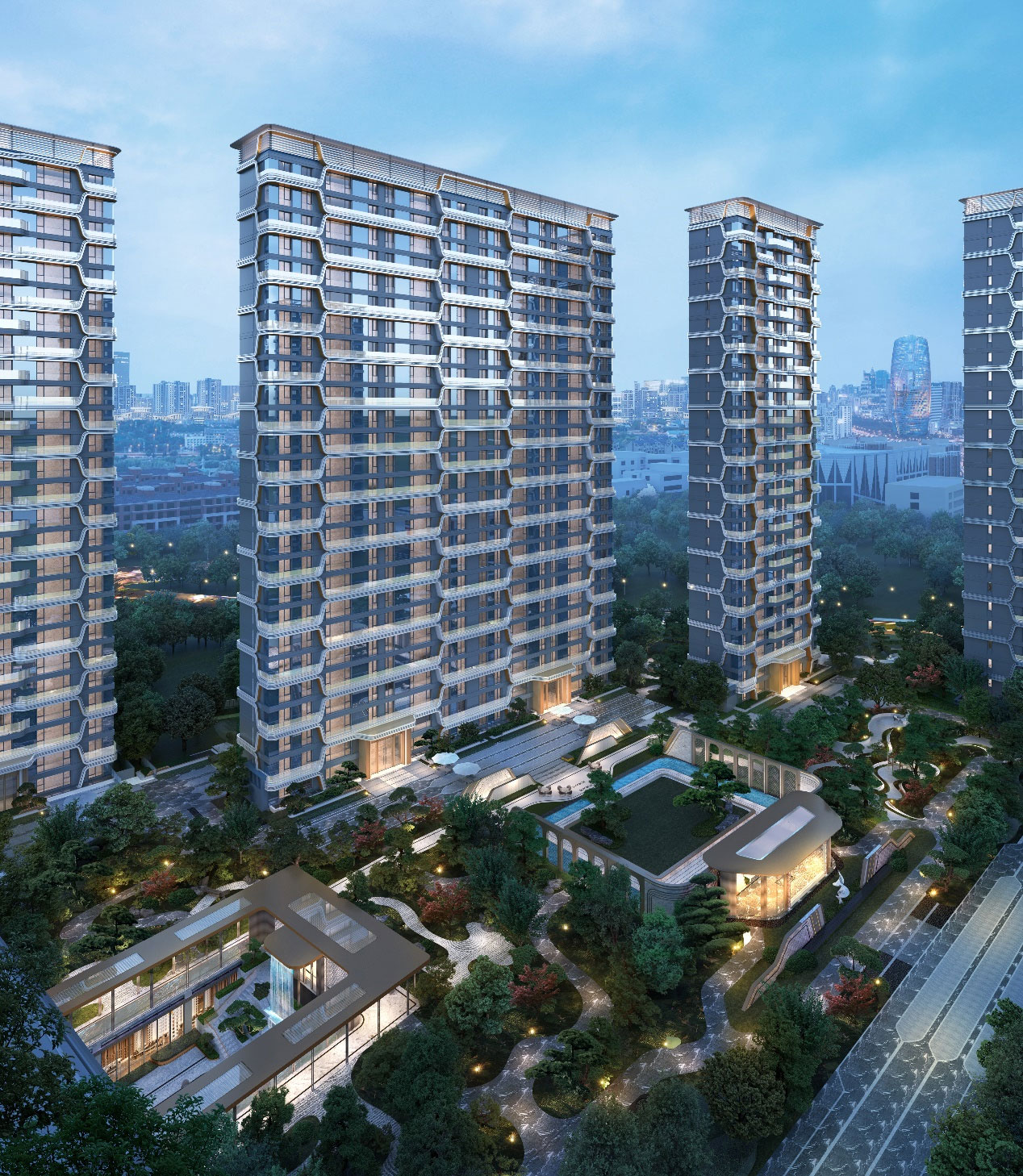建筑方面,联合HZS匠心共创,从中国建筑至高形制、与太和殿一脉同源的庑殿顶中提取元素,现代材质、简约风格、流线造型,首创中国大屋檐的高层式表达,成就世界美学中国建筑典范。超配采用1.7倍楼距系数,呈现约百米奢阔楼距,每一栋建筑都尽享阔景视野。