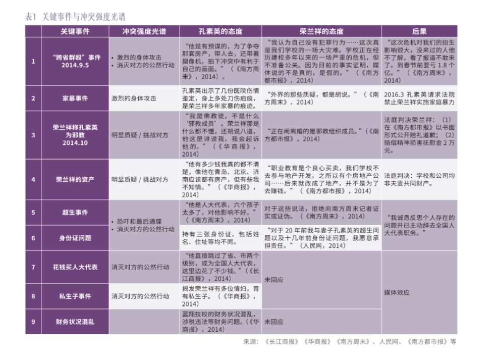 我们在第四阶段中以冲突强度光谱模型来形象地展现各种冲突行为的强度。“跨省群殴”、进京举报、被指七宗罪、互相揭发等呈现出各种冲突形式――荣兰祥和孔素英的离婚争夺战直接升级为席卷蓝翔技校所有师生及孔氏家族的混战――混杂着口头攻击、恐吓和最后通牒、激烈的身体攻击、消灭对方的公然行动等毁灭性冲突。表1中我们整理了第四阶段中的关键事件,并与冲突强度光谱模型相对照。