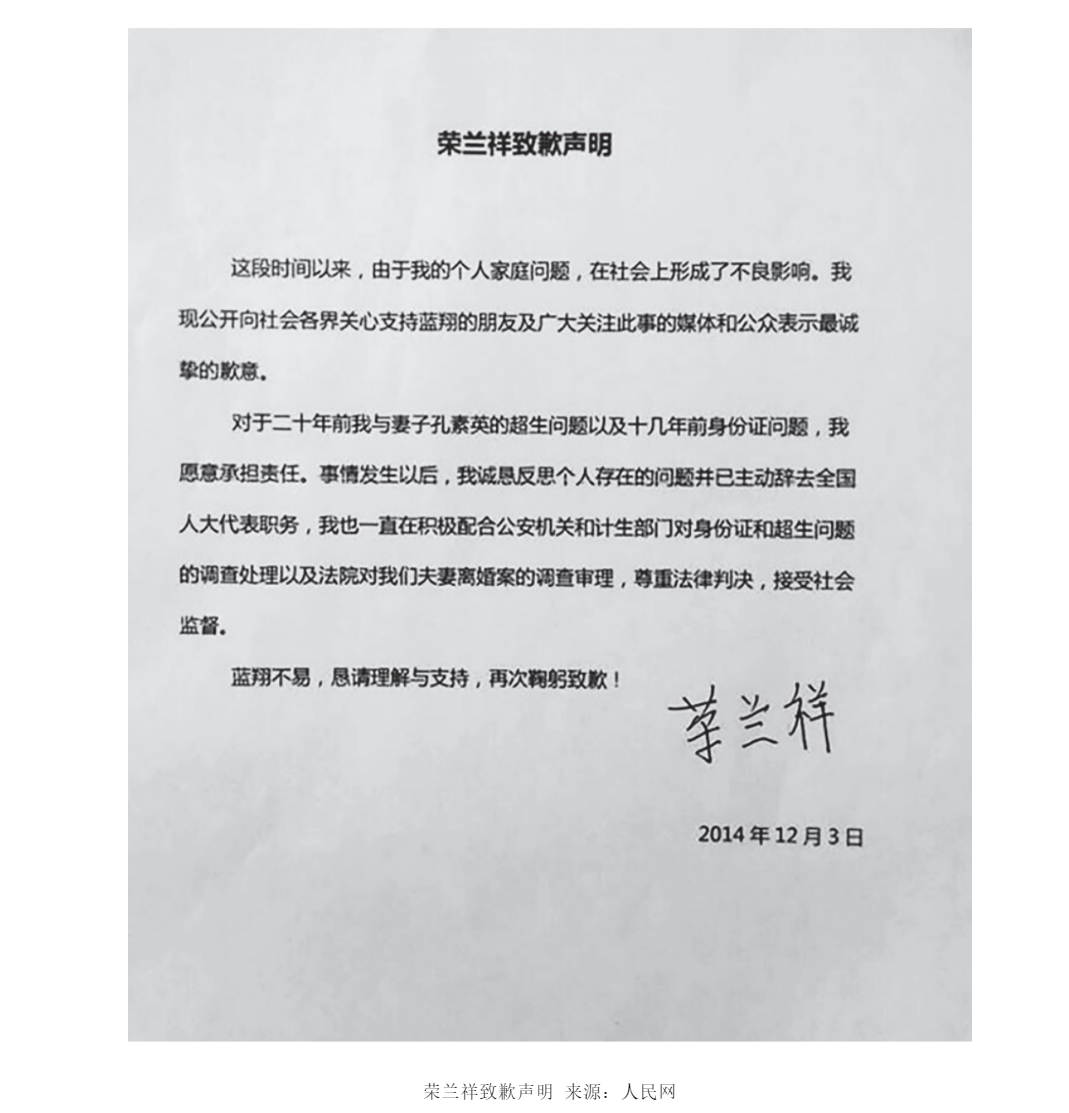 2014年11月21日,孔素英开始进京举报,向全国人大、全国政协、民建中央等指控荣兰祥涉嫌多种罪名,要求撤销其全国人大代表、济南天桥区政协委员、民建中央委员等职务(《华商报》,2014)。12月5日,荣兰祥发布致歉信,就个人家庭问题在社会造成了不良影响致歉,并主动辞任了全国人大代表(人民网,2014)。