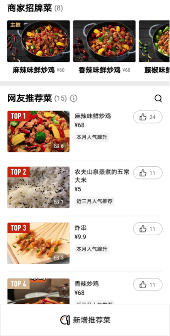 在大众点评上检索“鲜炒鸡”,对比出现的商户菜品价格可以看到,苗师兄鲜炒鸡的定价低于大部分同类产品的市场价。其郑州绿地店的菜单显示,3-4人用餐的大份炒鸡的会员价为68元,小份炒鸡的价格是45元。