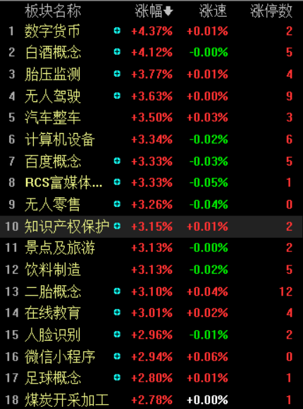 指数午后震荡走高,个股普涨,两市仅800只个股下跌,大小票分化,短线情绪活跃。指数主要受宁德时代等权重股波动影响,题材全线活跃,不过市场没有清晰的主线,二胎概念继续掀涨停潮,数字货币、白酒、无人驾驶等板块大涨,军工、核电、煤炭、旅游等轮番拉升,题材聚合力有所加强。整体看,资金存量博一下,板块持续性仍然存疑。盘面上,题材普遍收红,数字货币、白酒、无人驾驶等板块涨幅居前。截至收盘,沪指涨0.81%,报收3426点;深成指涨0.30%,报收13720点;创业板指跌0.26%,报收2783点。沪股通净流入33.14亿,深股通净流入38.39亿。