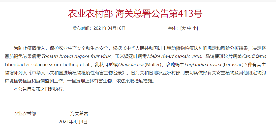 据农业农村部网站4月16日消息,为防止疫情传入,保护农业生产安全和生态安全,根据《中华人民共和国进出境动植物检疫法》的规定和风险分析结果,决定将番茄褐色皱果病毒Tomato brown rugose fruit virus、玉米矮花叶病毒Maize dwarf mosaic virus、马铃薯斑纹片病菌Candidatus Liberibacter solanacearum Liefting et al.、乳状耳形螺Otala lactea (Müller)、玫瑰蜗牛Euglandina rosea (Ferussac) 5种有害生物增补列入《中华人民共和国进境植物检疫性有害生物名录》。各海关和各地农业农村部门要切实做好有关寄主植物及其他限定物的进境检验检疫和疫情监测工作,一旦发现上述有害生物,依法采取检疫措施。