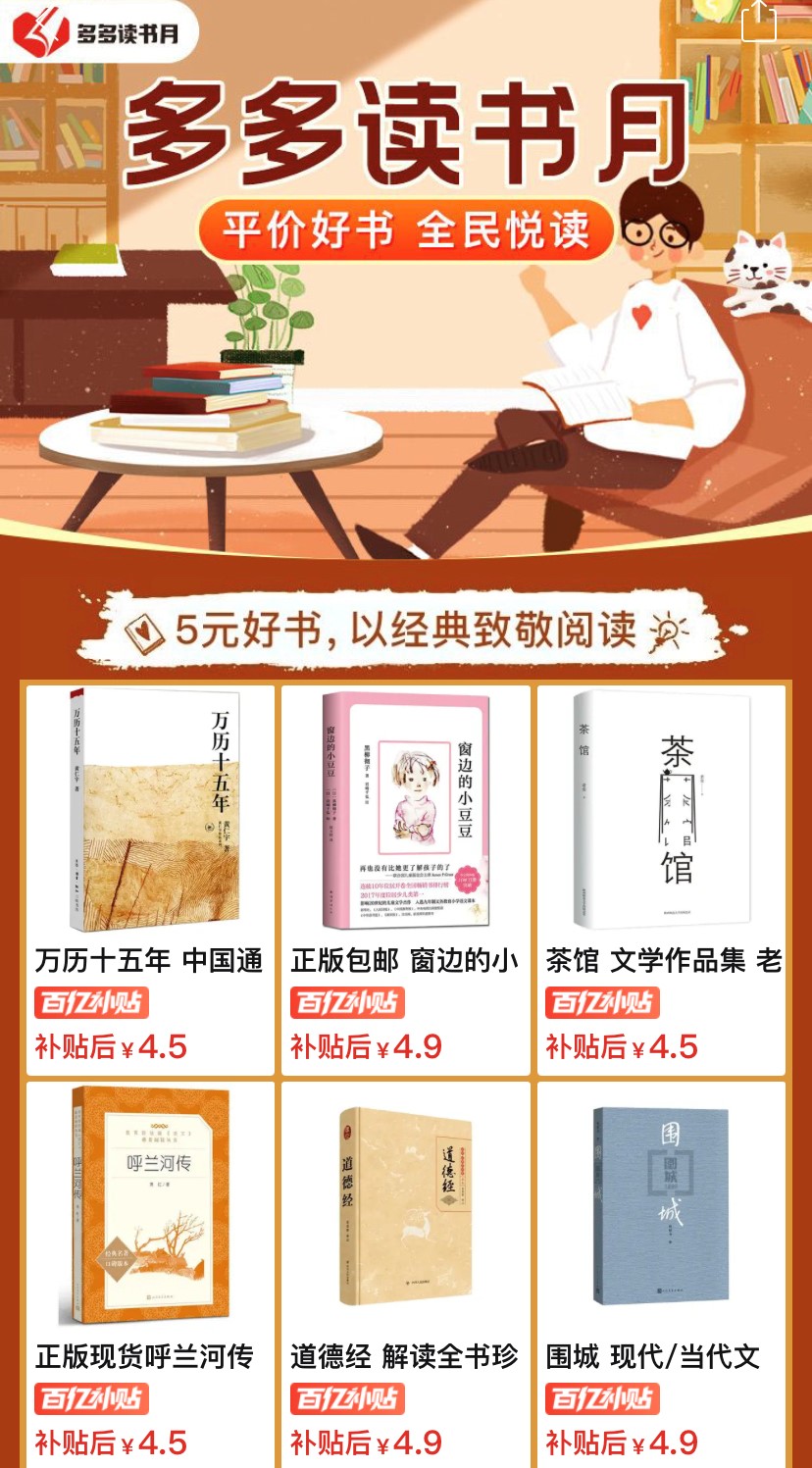 “多多读书月”负责人表示,此次“知识普惠行动”致力于“以经典致敬阅读”,补贴书目由十余位资深编辑从诺贝尔文学奖、雨果奖、星云奖、茅盾文学奖、施耐庵文学奖等获奖作品及全网各大阅读榜单中精选而来,包括商务印书馆、三联书店、人民文学出版社、中信出版社、中华书局等出版的众多经典名作。入选图书上千款,可享受读书基金补贴,帮助平台近8亿用户以全网最低价实现“悦读”。用户通过拼多多App百亿补贴频道或搜索“读书月”“多多读书月”便可从平台辑录的读书清单里以优惠价格“拼购”所喜爱的书籍。