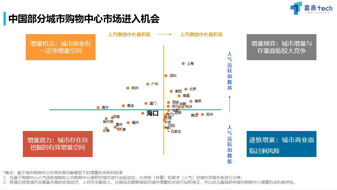 目前,海口人均购物面积和人气活跃指数都相对低于全国平均水平,分析表明海口现处于增量潜力区,海口城市内部仍存在待挖掘的有效增量空间,但这同时也说明了现今海口存量的运营水平指数偏低。从未来发展规划来看,海口购物中心市场增长空间较大,非传统核心城区是其增量主战场。