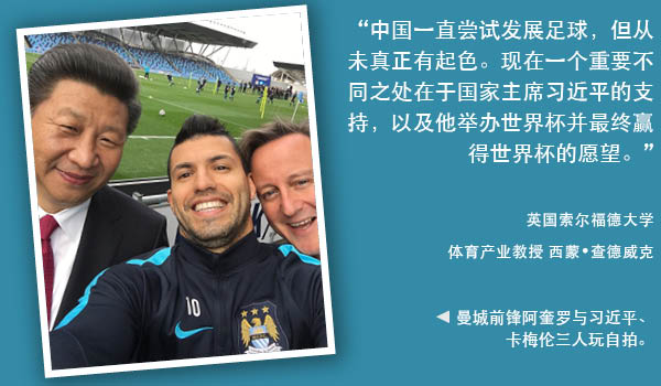 “几周之内,我们已看到世界足坛的实力平衡大幅向东方转移,”英国索尔福德大学(Salford University)体育产业教授西蒙•查德威克(Simon Chadwick)表示,“在过去20年的多数时间里,中国一直尝试发展足球,但从未真正有起色。现在一个重要不同之处在于国家主席习近平的支持,以及他举办世界杯(World Cup)并最终赢得世界杯的愿望。”