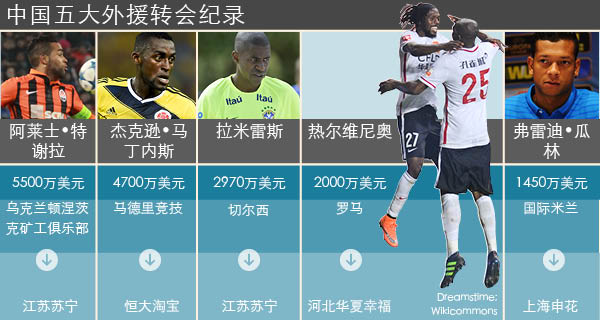 与早先引进过气明星的趋势不同,多家中国足球俱乐部将欧洲球队的顶尖球员引入麾下。今年2月,26岁的巴西中场球员阿莱士•特谢拉(Alex Teixeira),以创纪录的5500万美元从乌克兰顿涅茨克矿工俱乐部(Shakhtar Donetsk)转会到江苏苏宁俱乐部。这是短短几天之内中国转会纪录第三次被打破,据报道,江苏苏宁击败了试图签下特谢拉的英超球队利物浦足球俱乐部(Liverpool)。