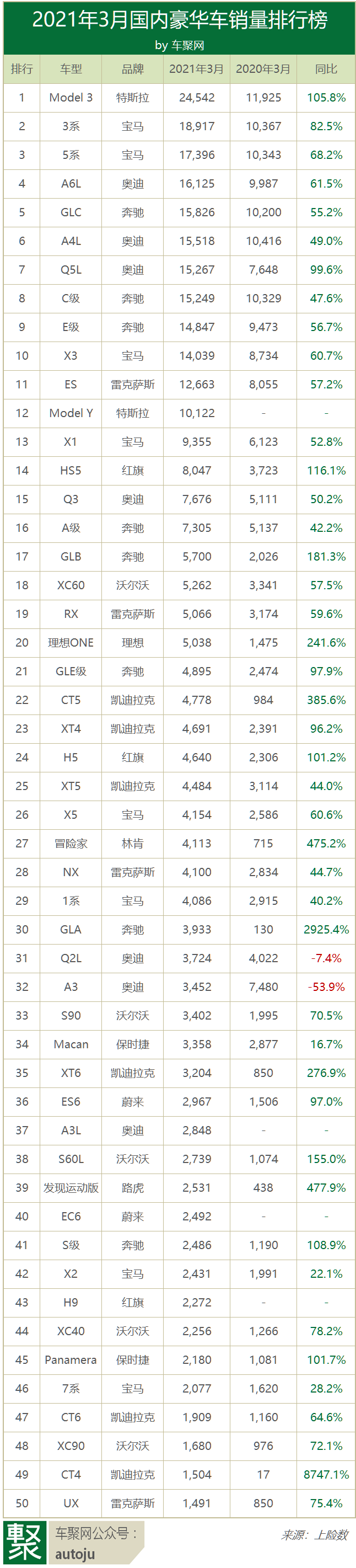 单车来看,Model 3以24,542辆的成绩登顶,也是3月唯一超过2万辆的豪华车。之前它的成绩还在第十名左右徘徊,春节后突然发力上位,令人惊讶。而且105.8%的同比增幅在前十中也是最高。