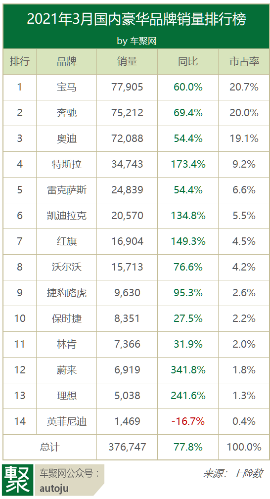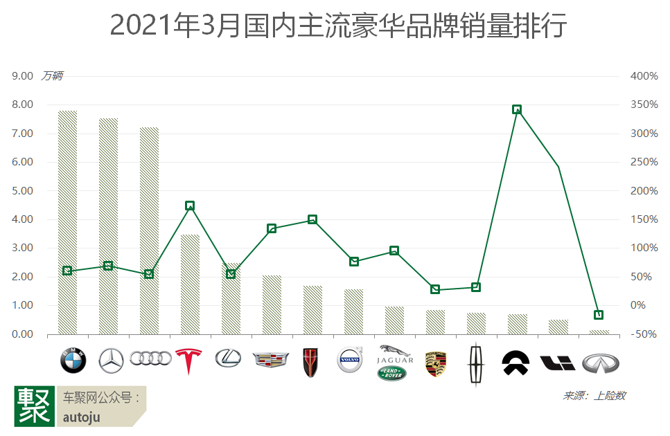 BBA虽然仍旧把持着豪车大部分份额,但却在大幅下降:2019年3月为68.8%,2020年3月降至66.0%,2021年3月更是跌破60%至59.8%,两年间下降了近10个百分点。
