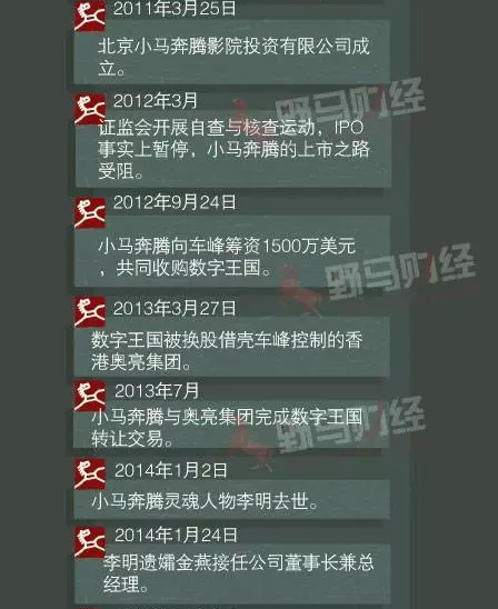 “我觉得我们在最好的时间错过了几次机会,至少三次”,小马奔腾辉煌过后,钟丽芳曾黯然感慨。前文提到的金燕曾依照李明生前的安排,引入华人文化产业投资基金接盘建银文化的股份,应该是小马奔腾走上良性发展的第四次机会,而金燕发在朋友圈“尽了最大的努力挽回,希望在小马坠落的悬崖边最后拦截一下”的内容,则向人们展示了那被错过的第五次机会。