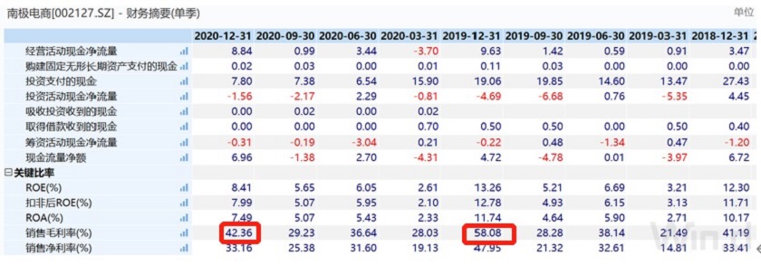 首先,就是2019年第四季度,南极电商高达58.08%的毛利率和47.95%的净利率。这组数据超过了南极电商历史上任何一个单季的毛利率、净利率水平。