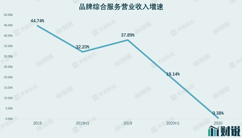 2018年到2020年,南极电商“品牌综合服务业务”的营业收入增速从44.74%一路下降到0.38%。该业务毛利率也呈下降趋势,从94.11%下降到93.26%。