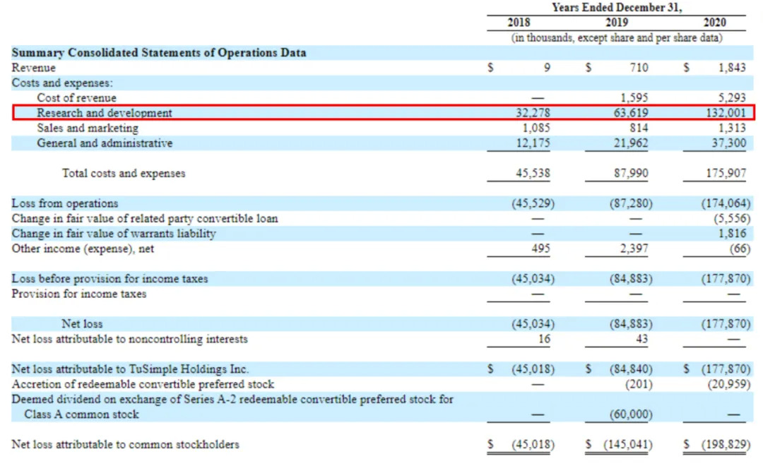 亏损的主要原因是高额的研发投入,2018年至2020年,图森未来的研发支出分别是3227.8万美元、6361.9万美元和1.32亿美元。而在可预见的未来,其运营及研发成本还会增加。