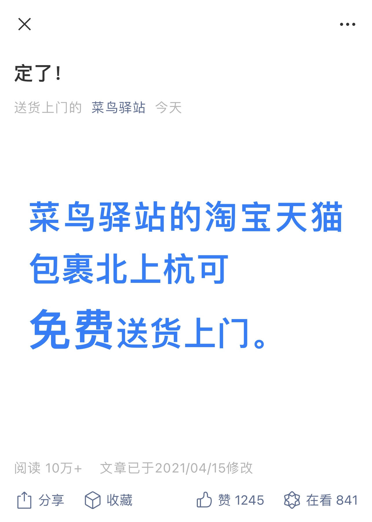 4月15日,菜鸟驿站紧跟其后宣布,北上杭可以送货上门,试图从模式上有所突破。