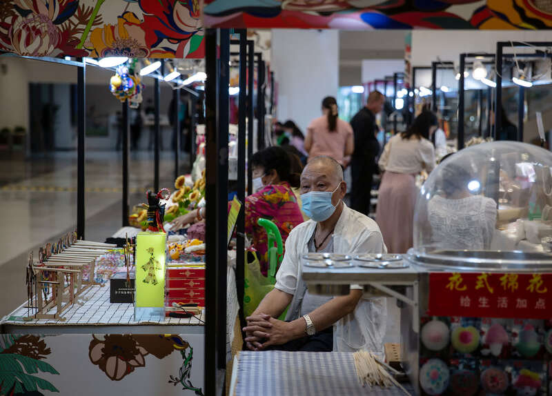 4月15日,深圳书城中心城,不定期举办的创意市集上,70多岁的湖北人熊大爷摆摊销售单手皮影。中青报·中青网记者 李峥苨/摄