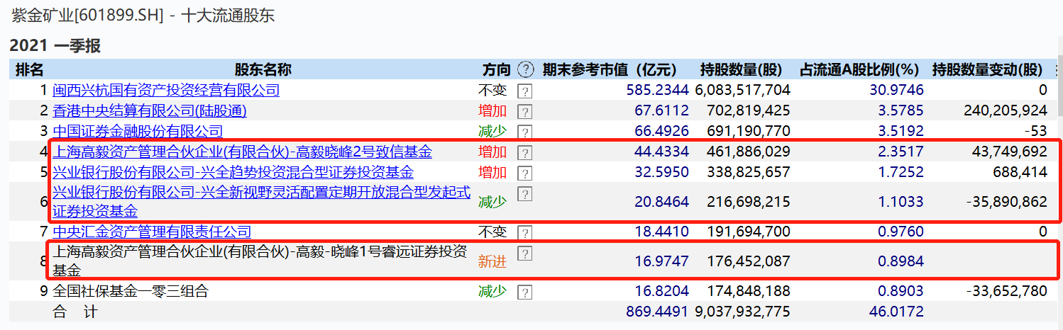 而高毅资产邓晓峰所管理的高毅晓峰2号致信基金,则延续了去年的买买买。2020年报显示,该私募基金新买入300万股,一季度,则再次买入4374.97万股。截至一季度末,该私募基金持有紫金矿业达4.62亿股,持股金额高达44.43亿元。