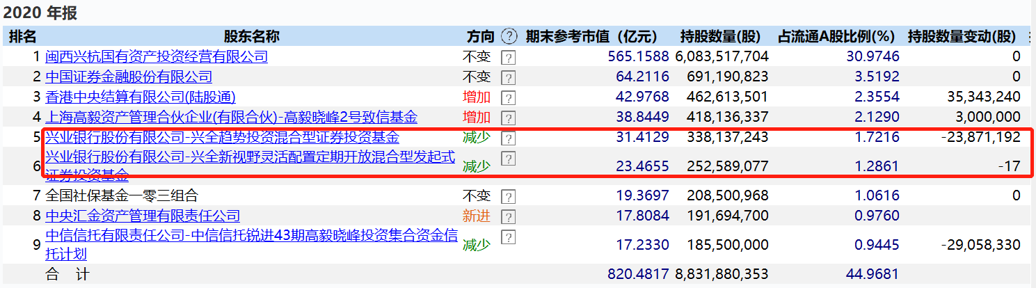 对比紫金矿业2020年报,董承非已经开始了“卖卖卖”风格。2020年报显示,兴全趋势投资、兴全新视野两只基金累计卖出2387.12万股,持股数量合计达到5.9亿元。