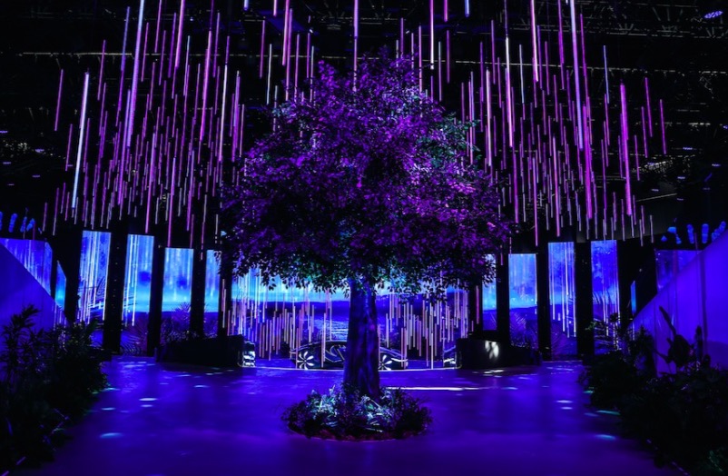 4月18日晚,在这场名为“奔驰EQ之夜”的发布会上,奔驰将影片中外星种族Na’vi族世代信仰的圣树“搬进”了现场。舞台荧幕上的清澈水源、生机盎然的海底生物、顶棚上的光影流苏吊顶皆营造出了一幅和谐生态的未来世界模样。