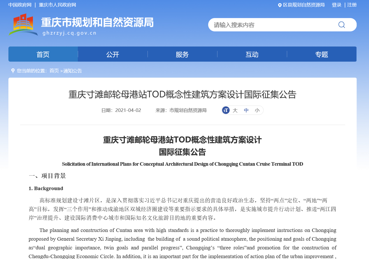 4月2日,重庆市规划和自然资源局一则《重庆寸滩邮轮母港站TOD概念性建筑方案设计国际征集公告》(以下简称《征集公告》),再次宣告了寸滩国际邮轮母港将打造为船、港、城、游、购、娱一体化发展全球内河邮轮第一港、重庆对外新窗口的重要战略地位。