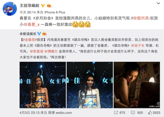 去年胡歌主演的热门剧集《大好时光》中也有春夏的身影,她在剧中扮演的是抢了茅小春前男友的神经病富二代艾琦。在她昨天拿到金像奖最佳女主角奖后,跟她在《岁月如金》中合作过的颜丙燕,以及《岁月如金》《大好时光》两部剧的编剧王丽萍都在微博上庆祝她获奖。